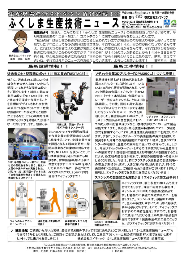 2014年9月-生産技術ニュース 生産技術ニュースBy admin2014年9月1日2014年9月の生産技術ニュースを発行致しました。 弊社では毎月定期的に、お客様やお取引先に「ふくしま生産技術ニュース」なる生産現場に役立つ情報を掲載した会報誌を無料で発行しております。 2014年9月の生産技術ニュース…