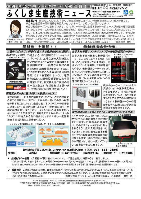 2014年6月の生産技術ニュースを発行致しました。 弊社では毎月定期的に、お客様やお取引先に「ふくしま生産技術ニュース」なる生産現場に役立つ情報を掲載した会報誌を無料で発行しております。 2014年6月の生産技術ニュース…