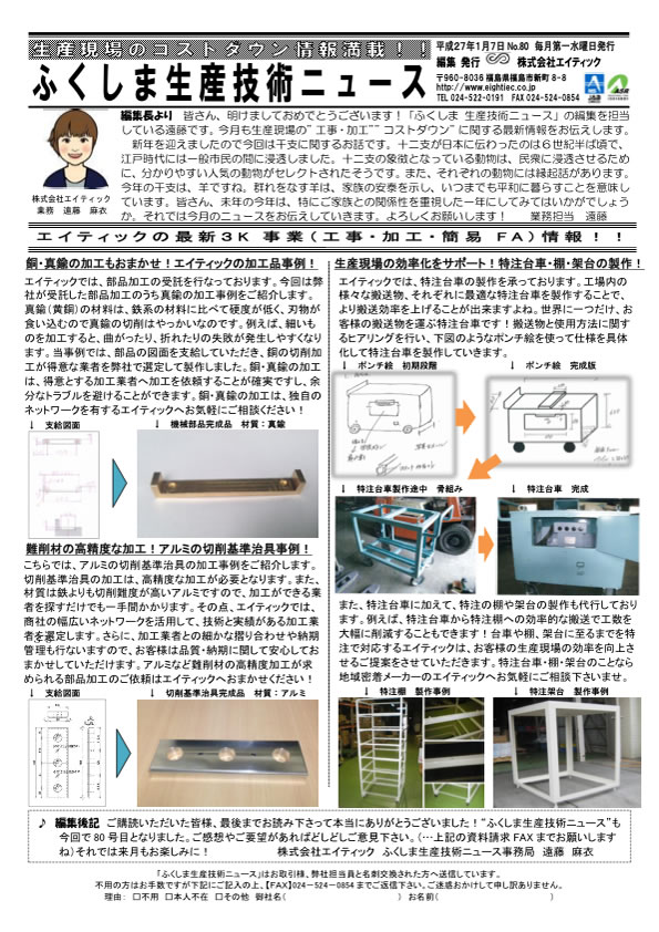 2015年1月-生産技術ニュース 生産技術ニュースBy admin2015年1月10日2015年1月の生産技術ニュースを発行致しました。 弊社では毎月定期的に、お客様やお取引先に「ふくしま生産技術ニュース」なる生産現場に役立つ情報を掲載した会報誌を無料で発行しております。 2015年1月の生産技術ニュース…
