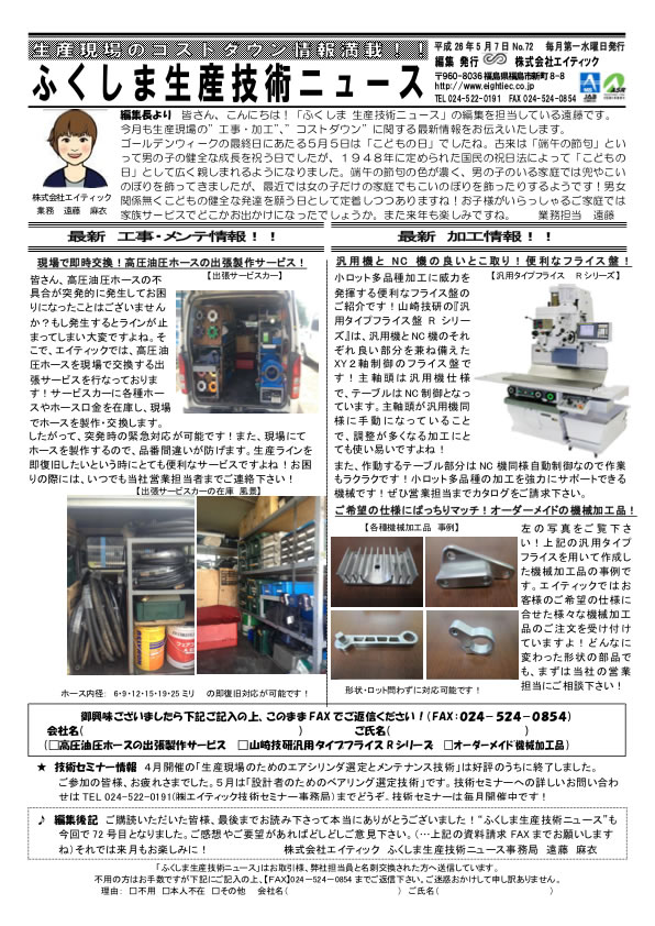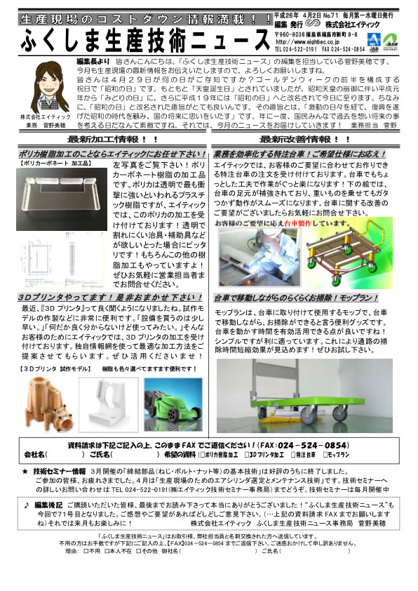 2014年5月-生産技術ニュース 生産技術ニュースBy admin2014年5月10日2014年5月の生産技術ニュースを発行致しました。 弊社では毎月定期的に、お客様やお取引先に「ふくしま生産技術ニュース」なる生産現場に役立つ情報を掲載した会報誌を無料で発行しております。 2014年5月の生産技術ニュース…